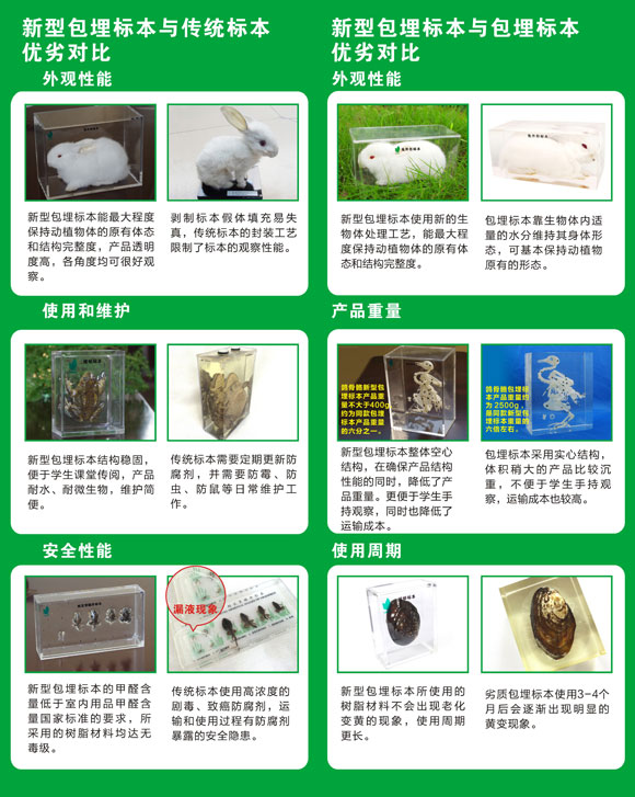 新型包埋標(biāo)本的特點(diǎn) ◆輕盈便攜、透明直觀:產(chǎn)品為空心結(jié)構(gòu),輕便易觀察。 ◆安全環(huán)保、自然真實(shí):使用包埋材料和封裝材料環(huán)保安全。先進(jìn)的動(dòng)植物干燥處理工藝,不破壞動(dòng)植物的原有的整體結(jié)構(gòu),更完整,更逼真。 ◆長久保存、性價(jià)比高:高分子材料滲透包裹處理,更經(jīng)久耐用?招慕Y(jié)構(gòu)降低產(chǎn)品的重量,性價(jià)比更高。 |
