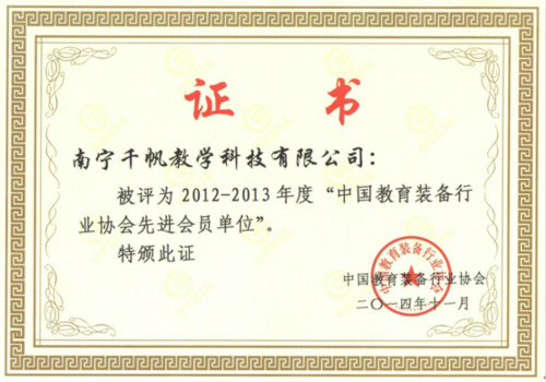 熱烈慶祝南寧千帆獲得了由中國教育裝備行業(yè)協(xié)會辦頒發(fā)的2012-2013年度“中國教育裝備行業(yè)協(xié)會先進(jìn)會員單位”證書,成為廣西本年度唯一一家獲此榮譽(yù)的企業(yè)。榮譽(yù)激勵(lì)著千帆人再接再厲,爭取為教育事業(yè)作出更多貢獻(xiàn)。