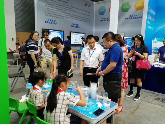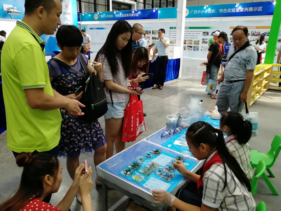 展會(huì)現(xiàn)場(chǎng)-工作人員給來訪人員介紹DIY學(xué)生實(shí)驗(yàn)制作解決方案產(chǎn)品及學(xué)生們展示DIY制作標(biāo)本